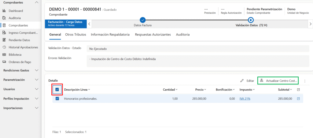 Para actualizar masivamente los centros de costo, debes ingresar a cada Comprobante, seleccionar las líneas a actualizar (para elegir todos se puede tocar el botón marcado en rojo) y tocar «Actualizar Centro Costos» (en verde):