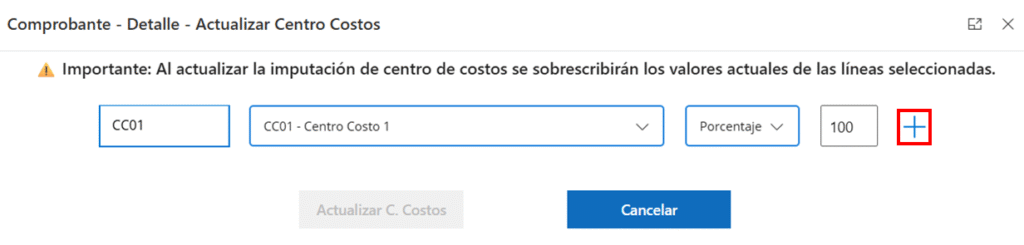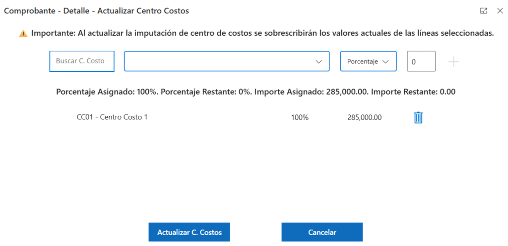 Una vez agregado, se irá mostrando el listado abajo. Cuando se llegue exactamente al 100%, se habilita el botón «Actualizar C. Costos», que actualiza para todas las líneas seleccionadas la imputación marcada