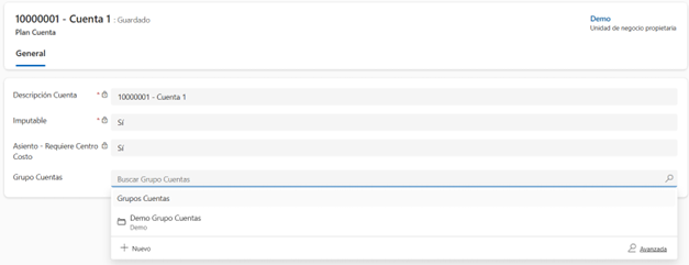 La asignación de una cuenta contable o un centro de costo a un grupo se realiza desde su menú maestro correspondiente: