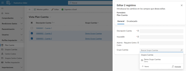 Si durante la edición masiva se selecciona un grupo que pertenece a una unidad de negocio diferente a la de alguna de las cuentas o centros de costo seleccionados, el sistema mostrará un mensaje de error y no permitirá completar la operación.